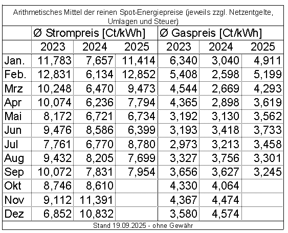 Das arithmetische Mittel der Spotmarktpreise liegt im September bei bisher 7,954 Ct/kWh (Strom) bzw. 3,245 Ct/kWh (Erdgas).