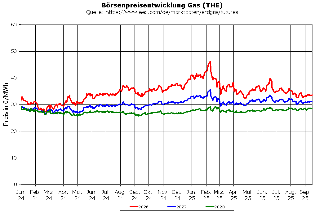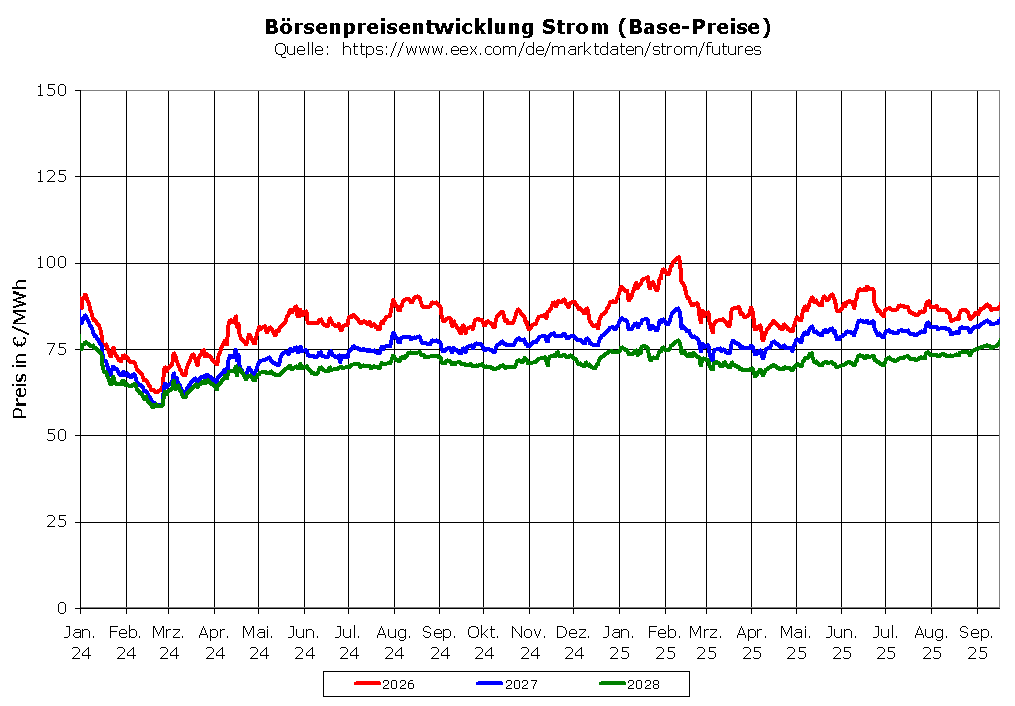 In der nachfolgenden Tabelle sind zur groben Prognose der Energiekosten die durchschnittlichen Preise am Spotmarkt je Monat aufgeführt. Die Entwicklung der Festpreise für die Jahre 2026 bis 2028 haben wir in den ebenfalls nachfolgenden Grafiken ausgewertet (Abhängig vom E-Mailprogramm sind diese ggf. noch downzuloaden). Bitte beachten Sie, dass individuelle Energiepreise aufgrund standortspezifischer Verbrauchsstrukturen vom arithmetischen Mittel abweichen.